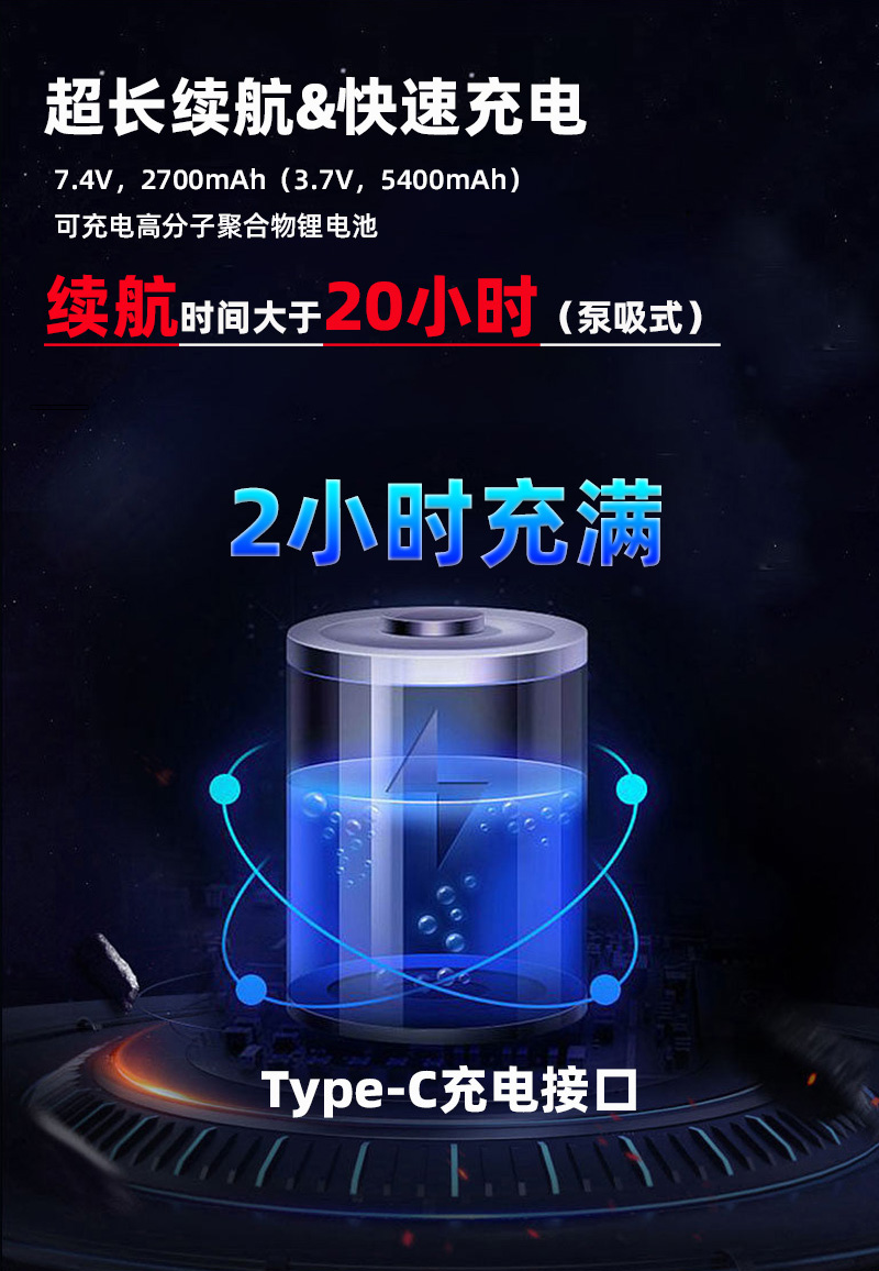 7.4V2700mAh3.7V5400mAh)可充電高分子聚合物鋰電池,續航時間大於20小時(泵吸式)